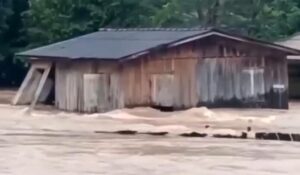 Uma casa foi arrastada pela força da correnteza após uma forte tempestade atingir o distrito de Nova União, em Cotriguaçu,…