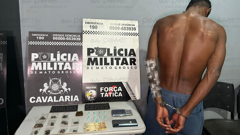 Na abordagem, foram encontrados uma porção de substância análoga à maconha e dinheiro em espécie. Com autorização para realizar buscas no imóvel, os policiais localizaram 11 porções de maconha prontas para venda, 9 pinos de substância semelhante à cocaína e uma balança de precisão com resquícios de droga.