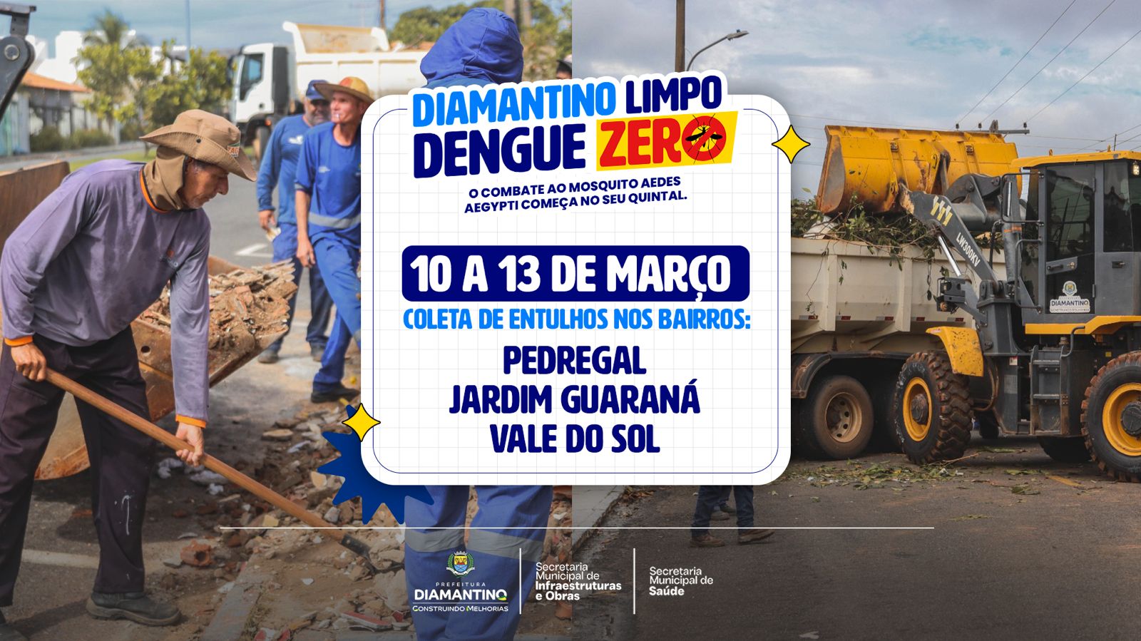 A Prefeitura de Diamantino, por meio da Secretaria Municipal de Infraestrutura e Obras, em parceria com a Secretaria Municipal de Saúde e a Vigilância Ambiental, segue com o mutirão “Diamantino Limpo, Dengue Zero”. A ação tem como objetivo recolher materiais que possam acumular água e favorecer a proliferação do mosquito Aedes aegypti, transmissor da dengue, zika e chikungunya.
